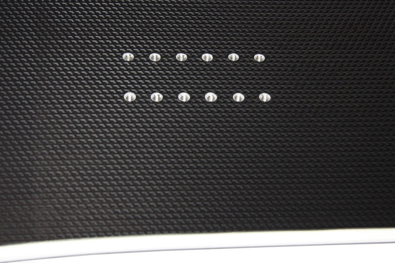 Die verbauten Edelstahl-Inserts (12 je Seite) sind symmetrisch zu den Boardenden und mittig zur Board-Längsachse angeordnet, so bieten diese flexible, vielfältige Möglichkeiten für die Positionierung der Bindungen und Wahl des Stance.